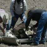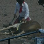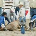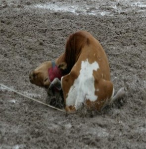 One final question about the abusive nature of today’s rodeo. What kind of human being would create a “sport” called calf roping? They have since changed the name of the “sport” to tie down roping, but let’s call it what it is, CALF ROPING. This is where a two to three month old calf, already terrified, is made to run as fast as possible in the rodeo arena and is then chased by a cowboy on his horse. With a rope, which is secured to his saddle, this brave cowboy ropes the calf around the neck bringing it to a sudden and life threatening stop. They call this clothes-lining! He then get’s off his horse runs over to the calf and lift’s it up and body slams it to the ground to deliberately wind the poor calf even more than it already is, so that he can then tie the calf’s legs together without difficulty. As you can imagine, many calves suffer broken necks, backs and legs during this unbelievable act of abuse and cruelty. Look at the pictures below and you answer the question.